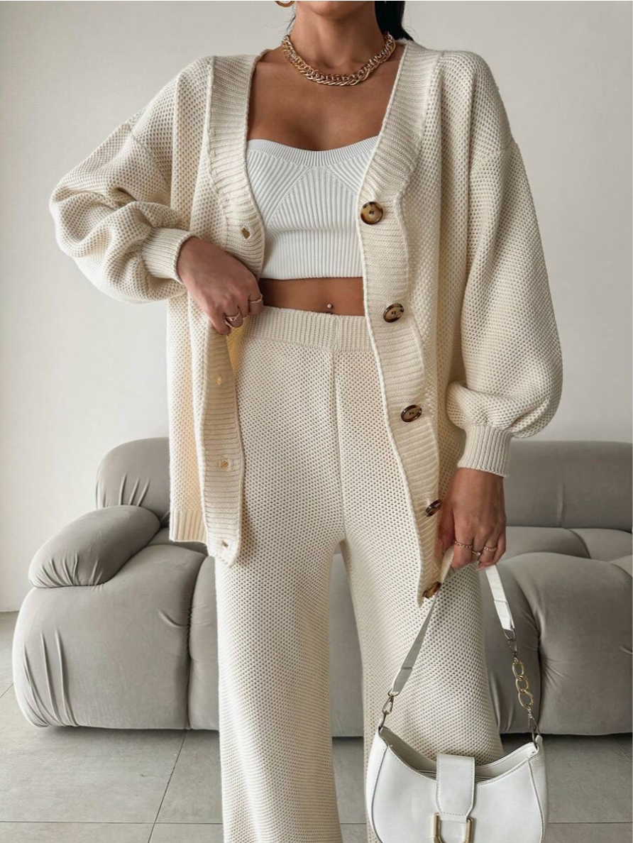 The Celeste Knitted Set features a refined V-neck design that combines elegance with comfort. The overall look is enhanced by its soft and breathable texture, making it suitable for various occasions, whether casual or more formal. This set is designed to provide a flattering silhouette while ensuring ease of movement, making it a versatile addition to your wardrobe.