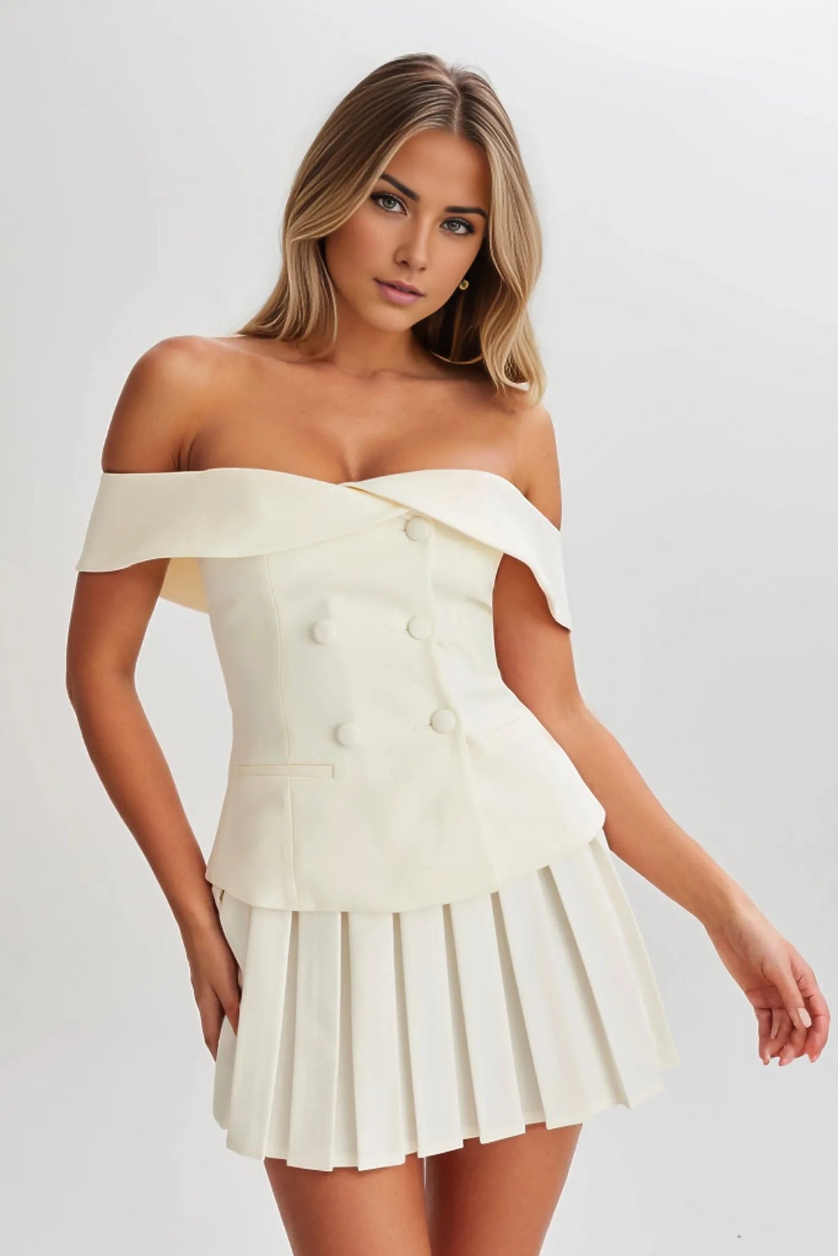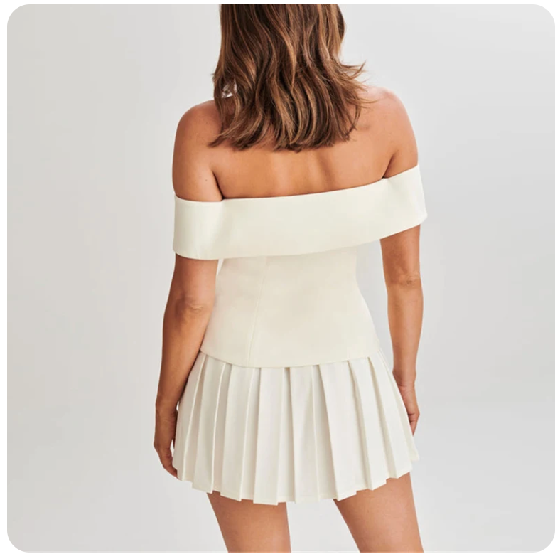 The Celeste Set features a chic design that effortlessly combines style and elegance. It showcases luxurious buttons that add a sophisticated touch. The overall look is refined, making it suitable for various occasions, whether formal or casual. This timeless piece is designed to enhance your wardrobe with its classic appeal.