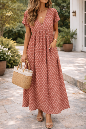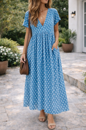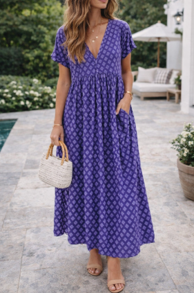 This maxi dress for women features a flattering V-neckline and is designed to be light and airy. With short sleeves, it is perfect for beach trips or casual occasions. The dress offers a bohemian style that makes it a great choice for summer.